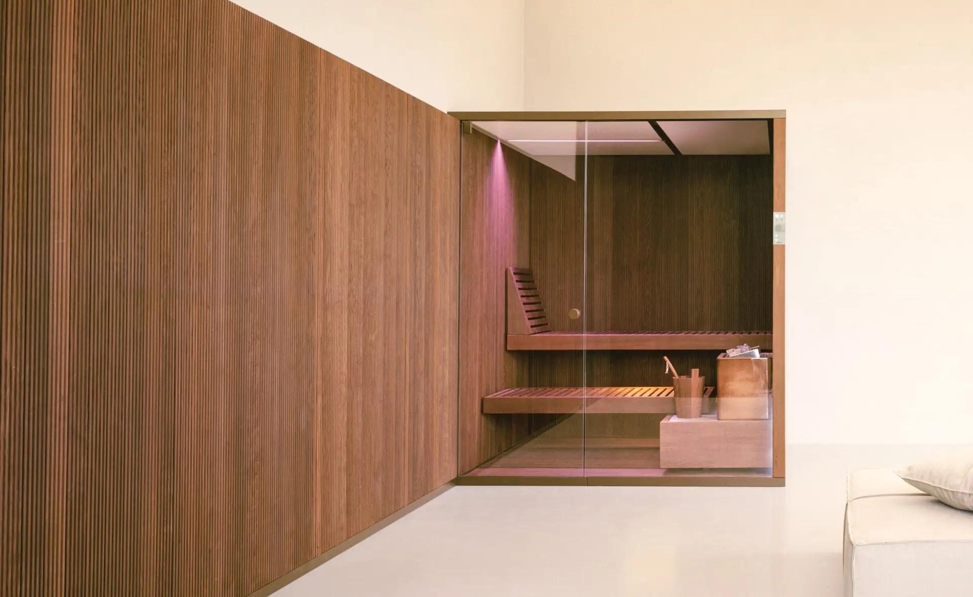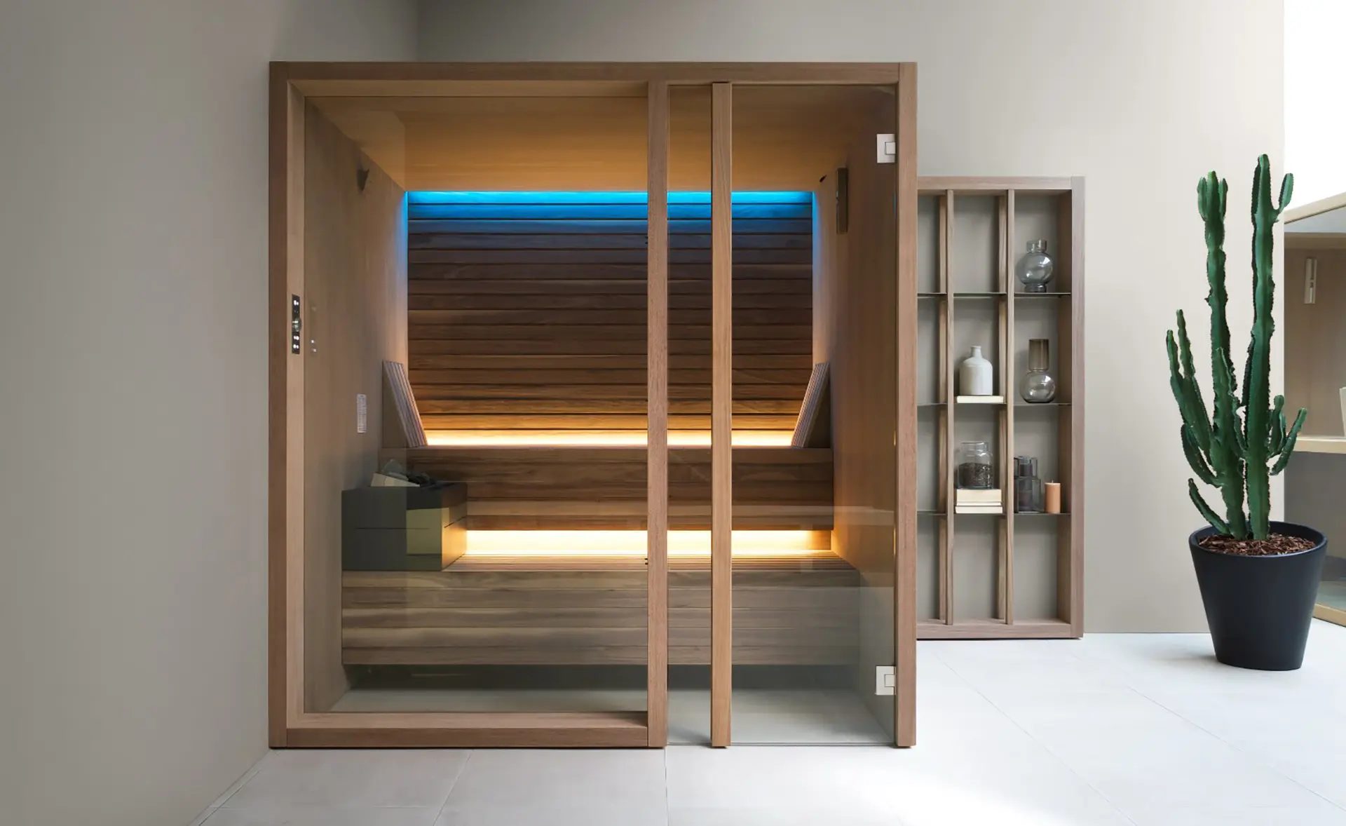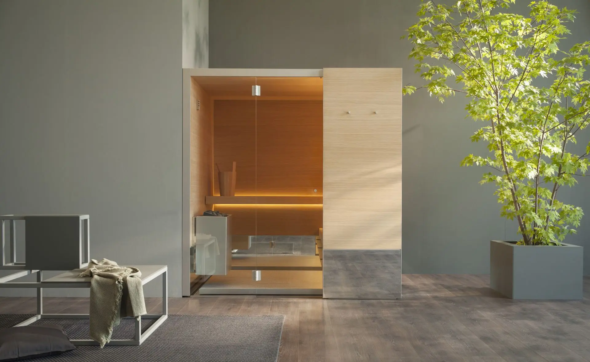 Diese sehr elegante Sauna überzeugt durch die Liebe zum Detail und lässt sich leicht in verschiedene Umgebungen einfügen – vom Living-Bereich bis zu den privaten oder öffentlichen SPAs.