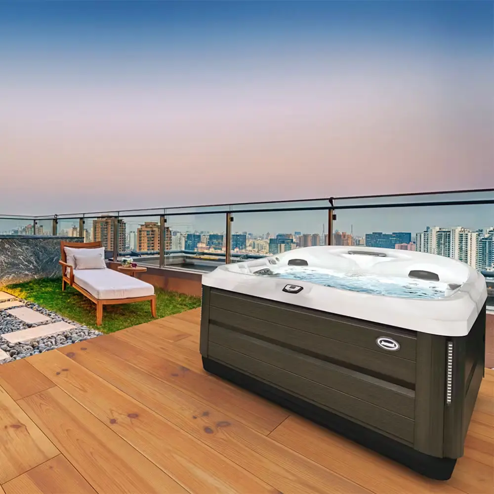 Dieser zwei Meter grosse Whirlpool J-435™ mit 5 Sitzoptionen bietet Privatsphäre, einen nach vorne ausgerichteten Liegesitz und einen Abkühlsitz mit Düsen und gehört damit zu unseren beliebtesten Modellen weltweit.